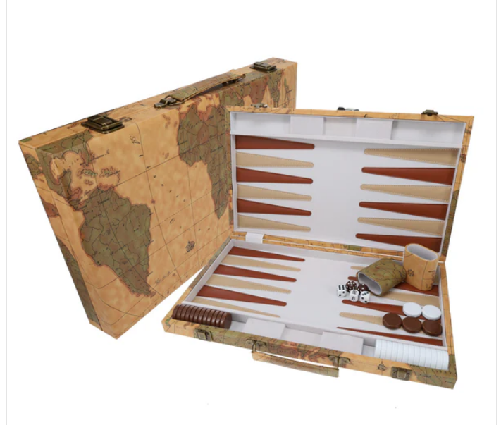 Tan Map Style Leatherette Backgammon Set, 18 x 11 in. closed